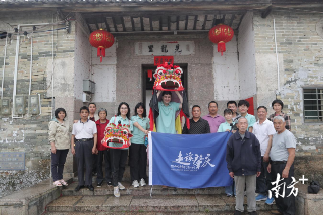 实践团队一行七人来到广宁县北市镇,只见一位村民手拿狮头,弯腰缩肘,左右伸探,山狮在村民的操控和铜锣和鼓点声中摇摆舞动,栩栩如生。围观的村民们个个兴高采烈,引颈而望。实践团成员们也被山狮的表现力和精湛技艺吸引得目不转睛,山狮的意义不仅局限于表演者本身,还有一起体验的人,是当地所有居民和谐与联系的纽带。据介绍,山狮舞正面临传承人才断层、创新能力薄弱、文化效益低等连串问题。如何将山狮文化“厚家底”转换为发展“新引擎”,广宁北市人正在不断探索实践。