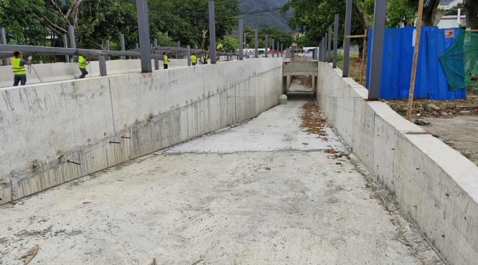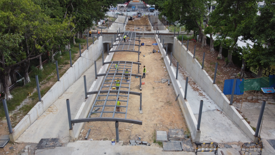 项目施工相关负责人黄先生介绍,项目主体工程已经基本完成建设,框架涵北侧和南侧的U型槽已经成型,项目目前整体施工进度在80%左右,接下来将进行雨棚安装和内部装饰等工序。