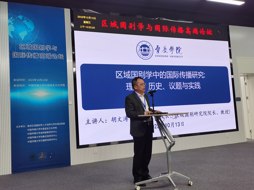 肇庆学院副校长、区域国别研究院院长胡文涛的发言题目为《区域国别学中的国际传播研究:理论、历史、议题与实践》,在发言中阐述了区域国别学中国际传播研究的逻辑起点、历史演变、关注焦点与实践应用。