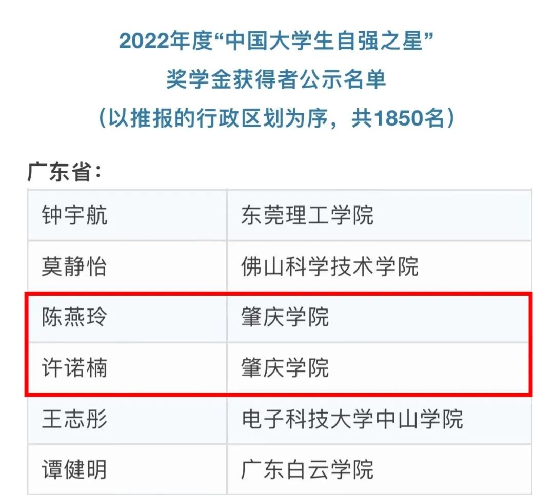 近日,2022年度“中国大学生自强之星”奖学金评选活动结果揭晓。肇庆4名高校学生获得2022年度“中国大学生自强之星”奖学金!他们分别是肇庆学院的陈燕玲、许诺楠,肇庆医学高等专科学校的廖利元以及广东理工学院的赵嘉熙