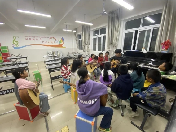 支教队员林逸泓在吉他课兴趣班,组织学生们了解吉他构造,学习正确的弹奏姿势和基础的弹奏技巧。吉他兴趣班让学生在乐趣中发展兴趣爱好,提升自我。