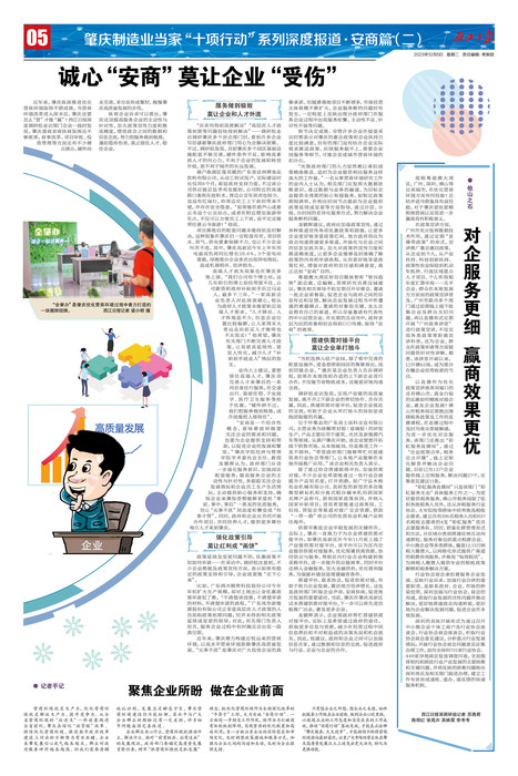 “安商是一个综合性概念,意味着政府既要关注企业的需求和问题,也要为企业提供支持和帮助,以促进企业的发展和繁荣。”肇庆学院经济与管理学院学术委员会主任、教授龙镇辉认为,政府部门应进一步强化服务意识,加强园区配套服务,提高服务企业的主动性与针对性,多跟踪关注企业发展情况和企业员工生产生活情况,主动提供贴心服务和支持,确保企业来肇投资都能够享受到“事前、事中、事后”一条龙的优质服务,勿让“无事不扰”因态度松懈变成“有事才管”。同时,政府和企业应共同开展合作项目、共同培养人才,提供更多舞台吸引人才来到肇庆。