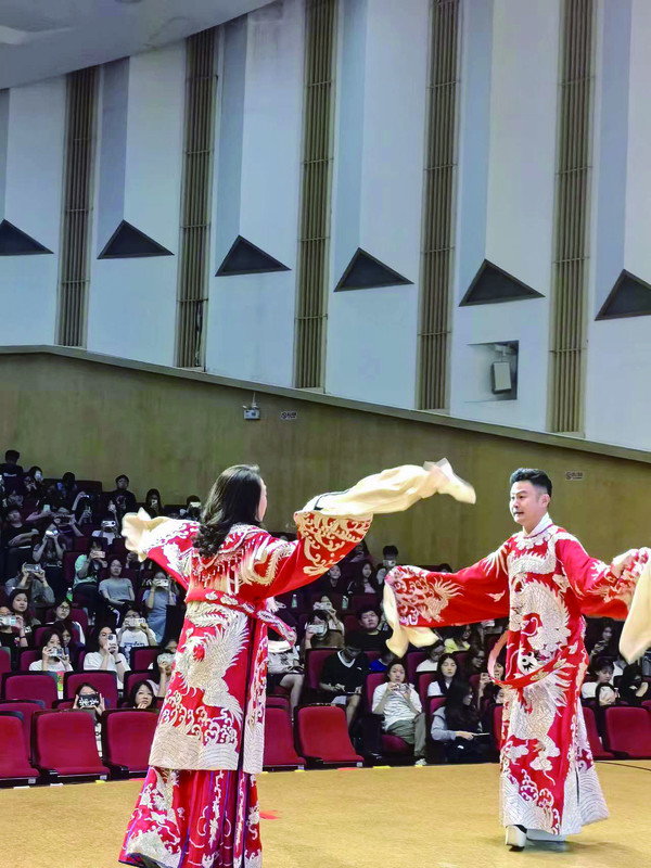 随后,朱女还介绍了粤剧音乐及演唱方法述要,包括粤剧唱腔音乐的分裂、演唱方法、唱腔特点以及发音要求等专业知识。在展示环节中,两位资深粤剧演员现场展示《帝女花 香夭》《六国大封相》《周瑜写表》《山伯临终》等选段中官话、地水南音等唱腔。演员们精湛的演技、华丽的戏服以及动人的唱腔,赢得了在场师生的阵阵掌声。