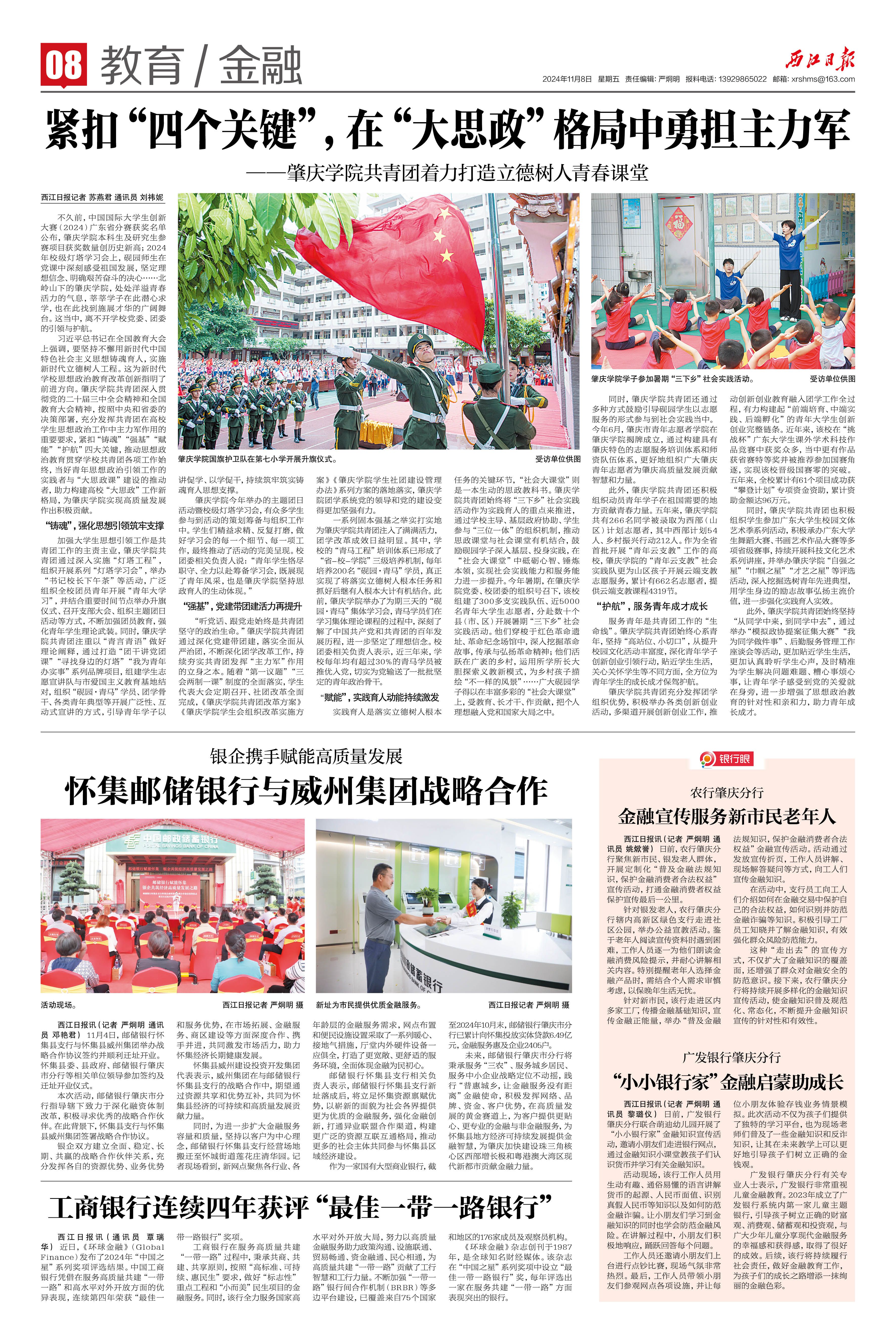习近平总书记在全国教育大会上强调,要坚持不懈用新时代中国特色社会主义思想铸魂育人,实施新时代立德树人工程。这为新时代学校思想政治教育改革创新指明了前进方向。肇庆学院共青团深入贯彻党的二十届三中全会精神和全国教育大会精神,按照中央和省委的决策部署,充分发挥共青团在高校学生思想政治工作中主力军作用的重要要求,紧扣“铸魂”“强基”“赋能”“护航”四大关键,推动思想政治教育贯穿学校共青团各项工作始终,当好青年思想政治引领工作的实践者与“大思政课”建设的推动者,助力构建高校“大思政”工作新格局,为肇庆学院实现高质量发展作出积极贡献。