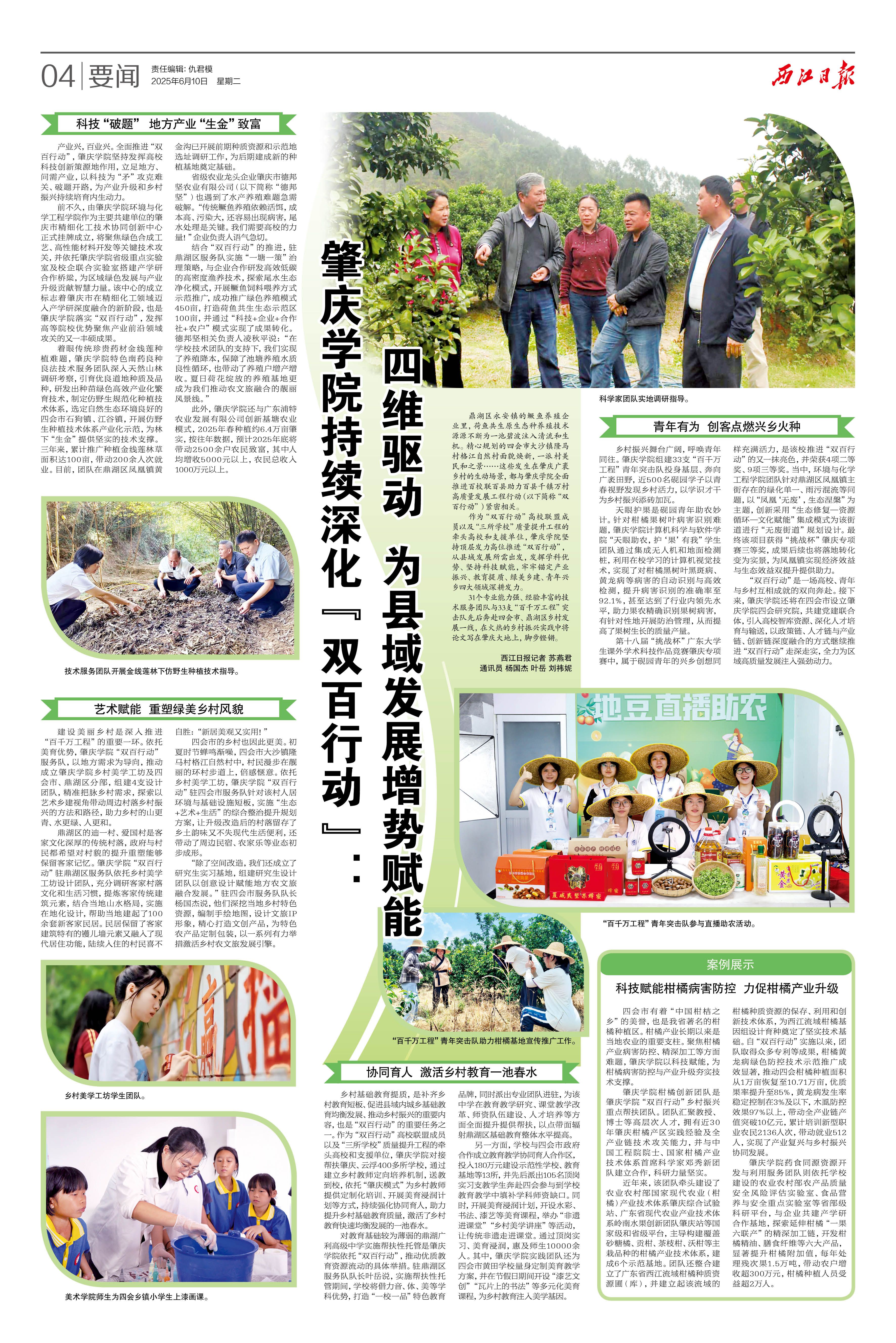作为“双百行动”高校联盟成员以及“三所学校”和县中质量提升工程的牵头高校和支援单位,肇庆学院坚持顶层发力高位推进“双百行动”,从县域发展所需出发,发挥学科优势、坚持科技赋能,牢牢锚定产业振兴、教育提质、绿美乡建、青年兴乡四大领域深耕发力。
