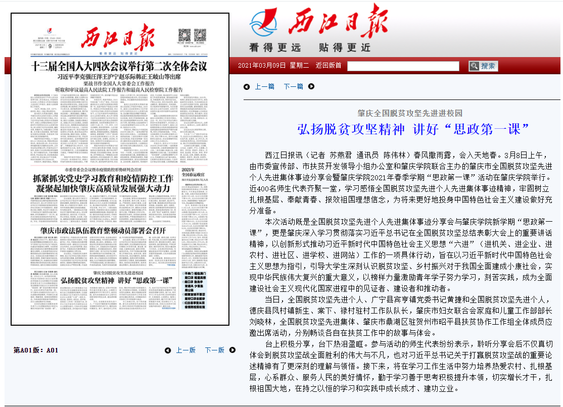 春风撒雨露,会入天地春。3月8日上午,由市委宣传部、市扶贫开发领导小组办公室和肇庆学院联合主办的肇庆市全国脱贫攻坚先进个人先进集体事迹分享会暨肇庆学院2021年春季学期“思政第一课”活动在肇庆学院举行。近400名师生代表齐聚一堂,学习感悟全国脱贫攻坚先进个人先进集体事迹精神,牢固树立扎根基层、奉献青春、报效祖国理想信念,为将来更好地投身中国特色社会主义建设做好充分准备。