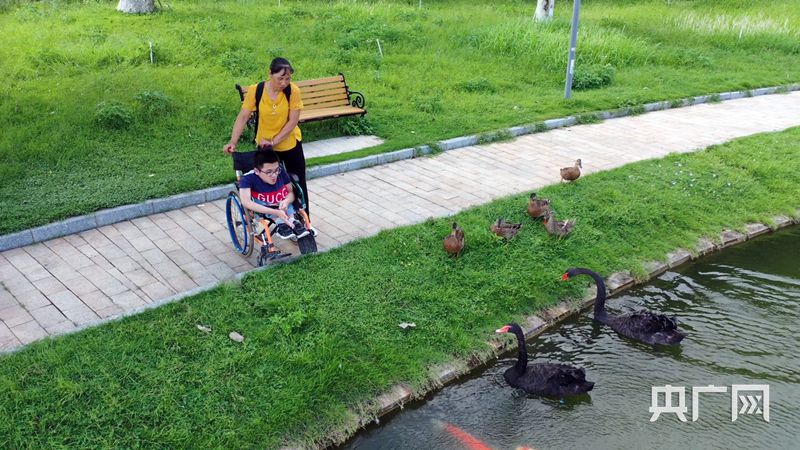 母亲推着曾廣在校园里散步(央广网记者 黄璐璐摄)