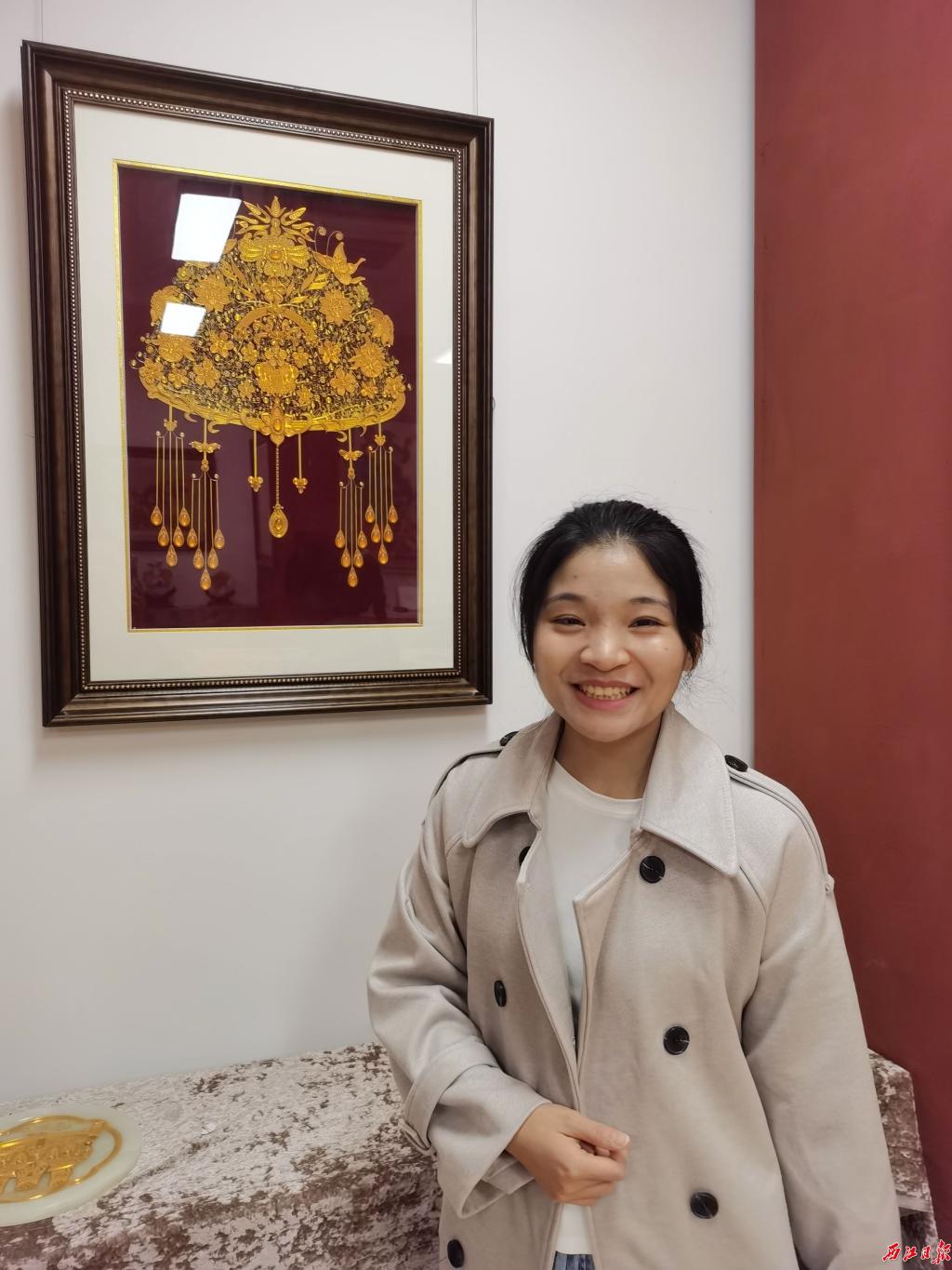 “我在大一的时候就开始接触学习广府金绣。因为自己从小对粤绣、粤剧等很感兴趣。受这些传统文化启发,特别想将古时女子婚嫁头饰用新的艺术形式表现出来。”莫雪玉说,她参考了不同朝代的女子凤冠,从中吸取灵感,并运用美术专业知识和经验创作了这次参赛作品,从设计到完工花了约一个星期时间。