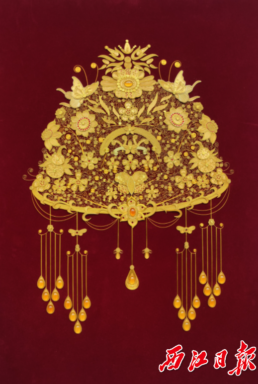 在“广府金绣”学府文创工作坊,记者见到了这幅金奖作品《凤冠霞帔——“巾”绣国粹》。蝴蝶、葫芦、莲花、吊坠……丝丝金线化成寓意吉祥的图案,通过制作人绝妙的设计和灵巧的双手,拼接成古时女子的婚嫁凤冠,金光灿烂,夺目耀眼。细看凤冠,只见工艺精巧,图样有主有次,繁而不杂,丝线缠绕的起承转合之处,均体现着制作人的巧思和功力。