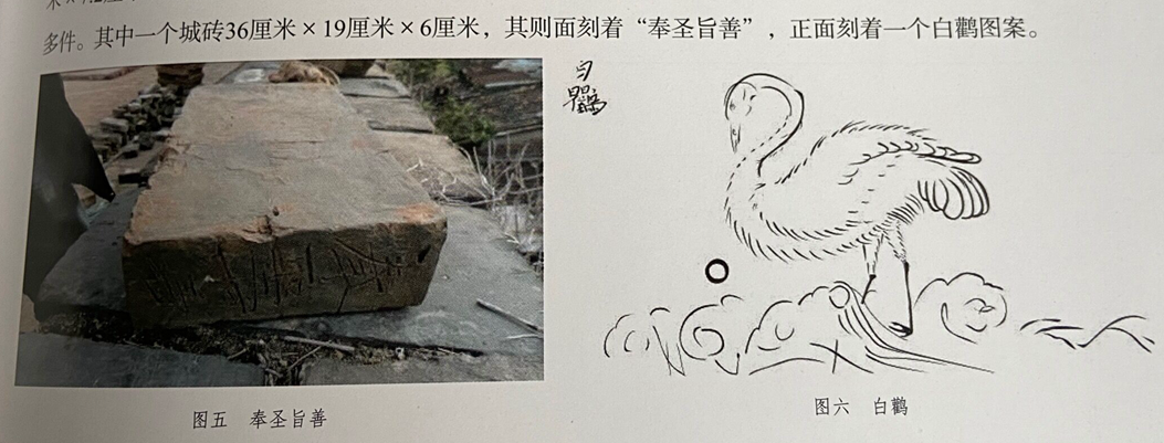 ▲“奉圣旨善”砖及其正面的白鹳图案。西江日报全媒体记者赖小琴翻拍。