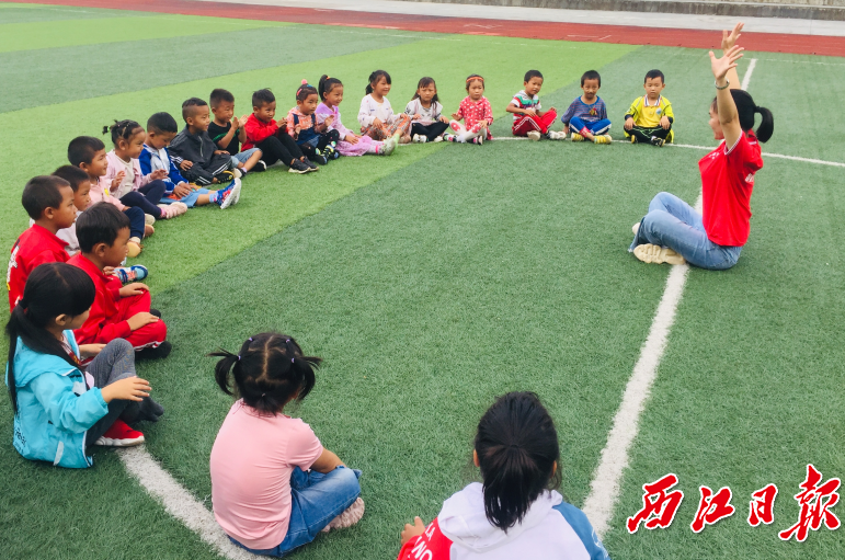 肇庆学院援藏支教队员带着孩子进行户外教学游戏。肇庆学院供图
