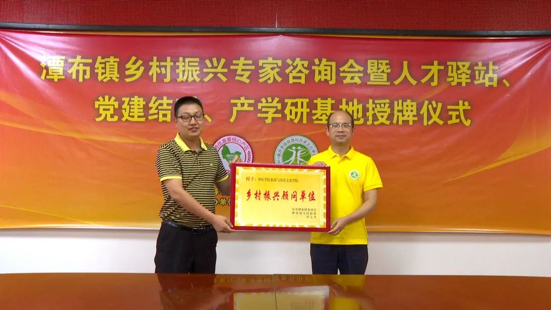 授牌仪式上气氛热烈和谐,潭布镇对肇庆学院一行的到来表示热烈欢迎,并简要介绍了该镇乡土民情、区位优势等情况,希望双方通过党建共建,进一步加强沟通,密切联系,合作发展。肇庆学院专家组也结合自身发展领域,在人才培养、科学研究、社会服务等方面为潭布镇的高质量发展建言献策,希望双方通过开展党建产学研基地共建活动,实现优势互补、资源共享、共同发展。随后,肇庆学院旅游与历史文化学院分别向潭布镇授予社会实践定点单位、产学研基地,还为潭布镇社岗村授予党委结对村,潭布镇也为肇庆学院授予乡村振兴顾问单位。