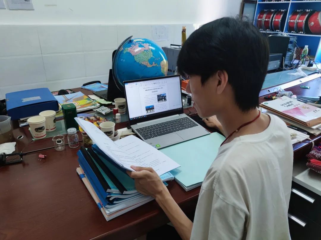 图为支教队员孙泽烽在对学校新闻材料进行校对及整合
