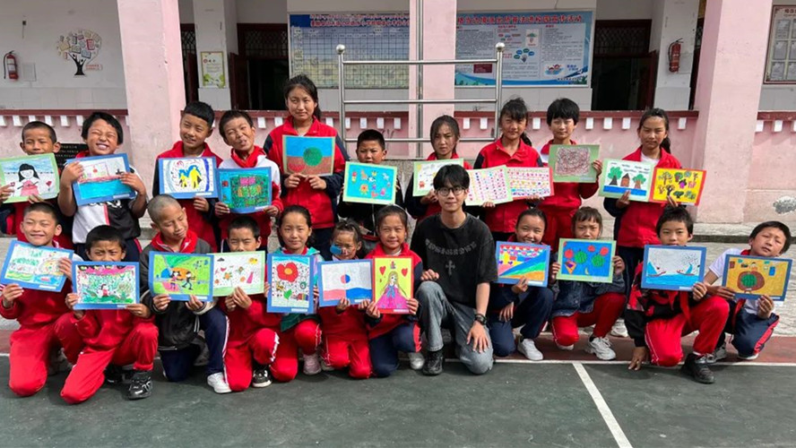 支教期间,支教队员丘梓鹏曾担任美术、道德与法治、音乐和信息课教师,还承担了校长办公室助理的角色,协助校长处理各种校务工作。在稳步推进与创新教学工作的同时,丘梓鹏课余时间积极开展兴趣班活动,时常与学生共同设计、绘制各节日主题的黑板报,绘制校园文化墙绘等,美化校园环境,推进校园文化建设。并走访当地农牧民家庭,开展家访、为行动不便的学生进行“送教上门”。在校支教的最后一周还举办了“缤纷校园·绘彩童年”格当乡小学首届美术作品展览,给学生的作品一一装饰后展出,以“让美育之花在雪域高原绽放”为目标,把更多的知识与陪伴了西部的孩子们。