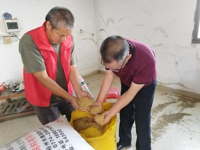 七月骄阳似火,大地高温酷暑。7月22日,肇庆市人大代表、九三学社肇庆市委员会副主委、肇庆学院档案馆馆长班荣鼎教授驱车170公里,来到封开县南丰镇侯村榕根小组的侯炳新家,看着侯家人和村干部将一袋袋金灿灿的富硒稻谷过称后,搬到大货车上,并结算稻谷款,然后将这些富硒稻谷拉回到鼎湖碾米厂加工。
