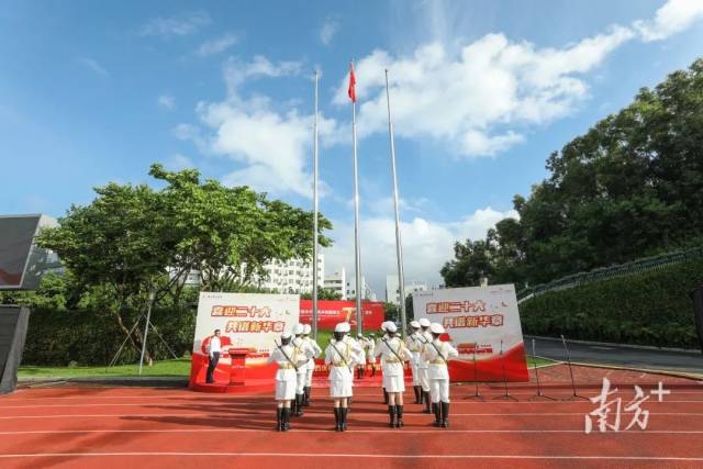深圳大学举行“青春不负,强国有我”主题升旗仪式。迎着朝阳,国旗仪仗队步伐铿锵。五星红旗迎风招展、冉冉升起,全体师生面向国旗肃立致敬、行注目礼。