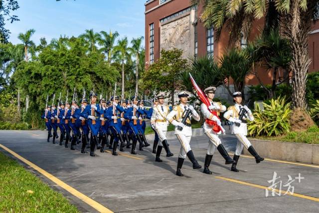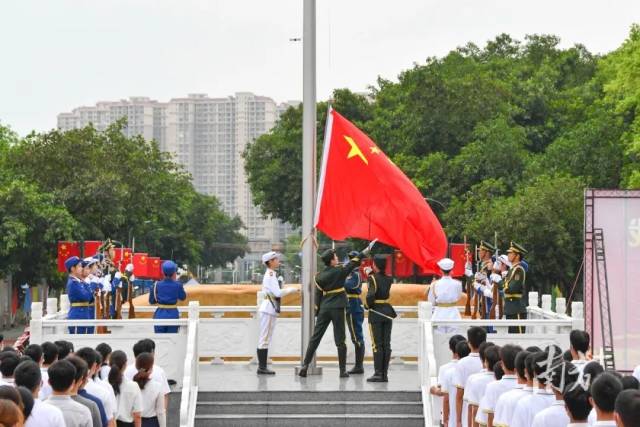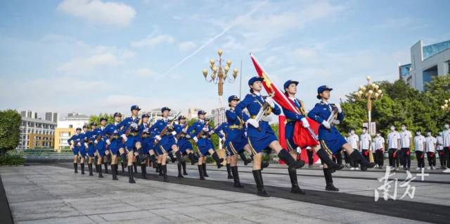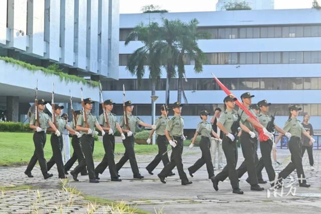 华南农业大学在行政楼广场举行庄严的升旗仪式,许多师生自发来到广场前,见证五星红旗冉冉升起的庄严时刻。国旗护卫队步伐整齐,脚步铿锵。