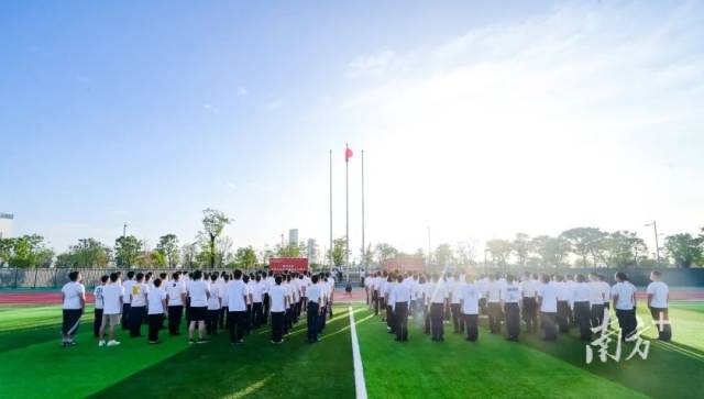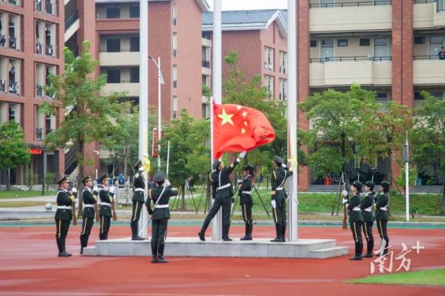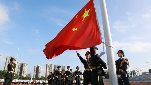香港科技大学(广州)举行首次国庆升旗仪式,师生员工代表整齐列队在室外体育场,一同为祖国母亲献上祝福。