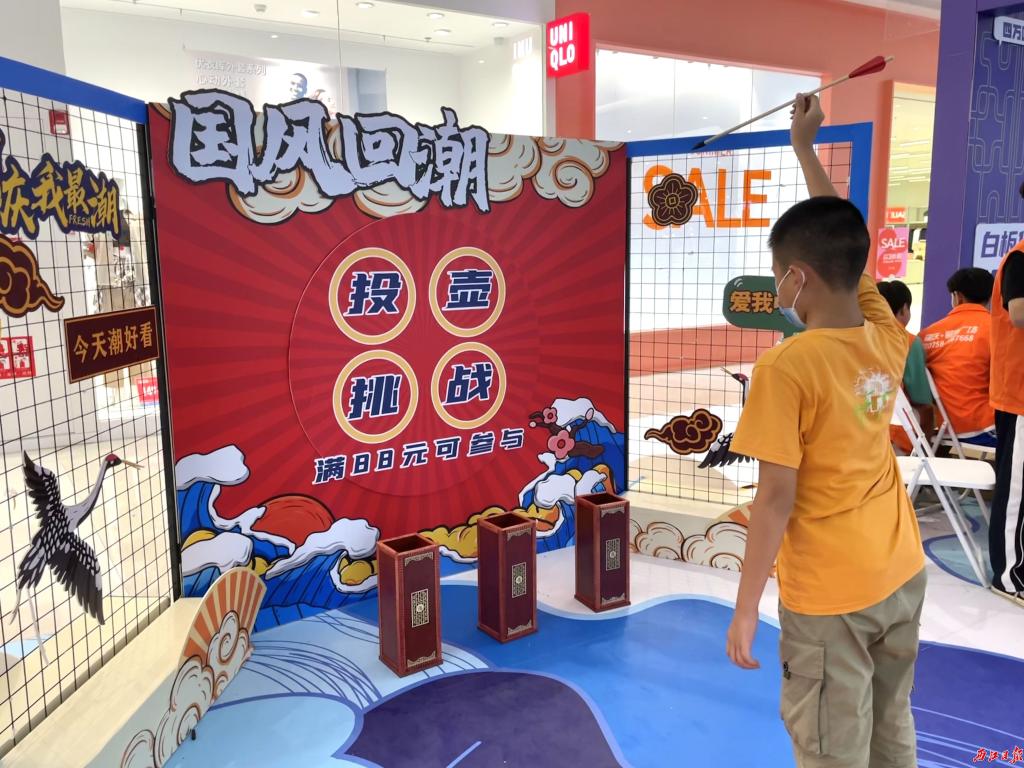 “购物抽大奖”“满300立减30元”……国庆假期商圈内各商家紧抓黄金周消费热潮,推出各类国庆优惠活动吸引市民游客。在肇庆敏捷广场,手机店推出以旧换新、补贴优惠,服饰店推出第二件半价优惠,餐饮店推出低价优惠券。值得一提的是,该商场还特别举办了“国风回潮”主题活动,吸引市民游客参加趣味活动“穿越古代”,赢取场内不同商家“福利”。投壶、逛古风集市、看“东方秀场”……有玩有逛还有机会中奖,这也成了商场内除各类店铺外,十分吸引集聚市民的一个场所。