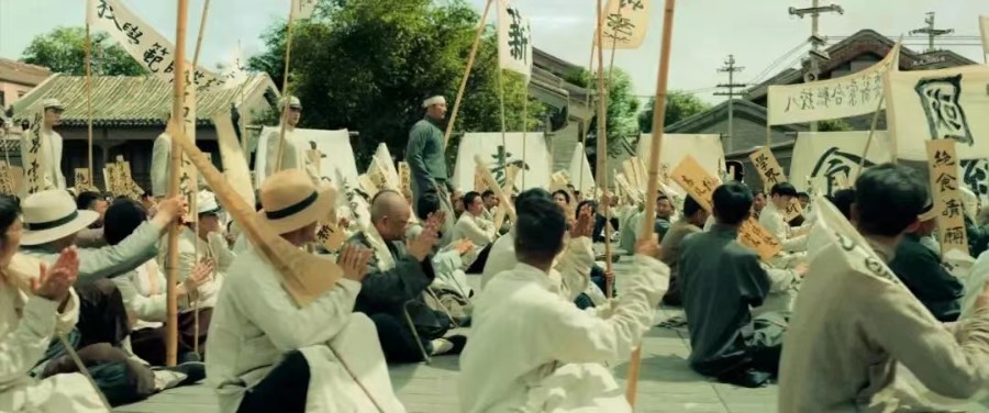 这与个人的街头行为一样,表现出对信仰的坚守。例如北京街头的“五四运动”,主要是以“闪回”的方式展开的,体现在陈独秀的回忆,以及刘仁静在众人询问中的回忆,这是一种相对虚化的表现。但是上海街头的工人罢工则不同,这是一种发生在“一大”前后的真实行动。电影中呈现的上海英美烟厂工人罢工,是由中国共产党领导的第一次有组织的工人罢工。1921年7月20日,上海英美烟厂工人不堪资方虐待,八千多工人参加了同盟罢工。当时正值中国共产党第一次全国代表大会在上海召开,党组织得知消息后,即派党员李启汉到厂指导。这场罢工在持续20多天后终于取得胜利。电影中李启汉在街头号召工人们团结起来,坚持斗争到底,他紧握的拳头,坚定的表情,声嘶力竭的嗓音,以及工人们群情激昂,堆砌沙包抵御警察,不同的画面互相配合,体现出工人们的强大力量与众志成城。