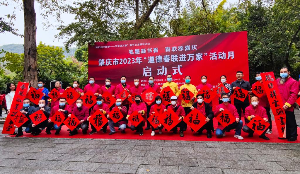 1月8日上午,由肇庆市文联、肇庆星湖管理局、肇庆学院、肇庆美术馆、黎雄才美术馆、肇庆市书法家协会联合主办的2023年“道德春联进万家”活动月启动仪式在七星岩西江情小广场举行。书法家现场挥毫,免费为市民写春联、送福字,将新春美好祝福送到千万家,让即将到来的春节增添浓浓“年味”。
