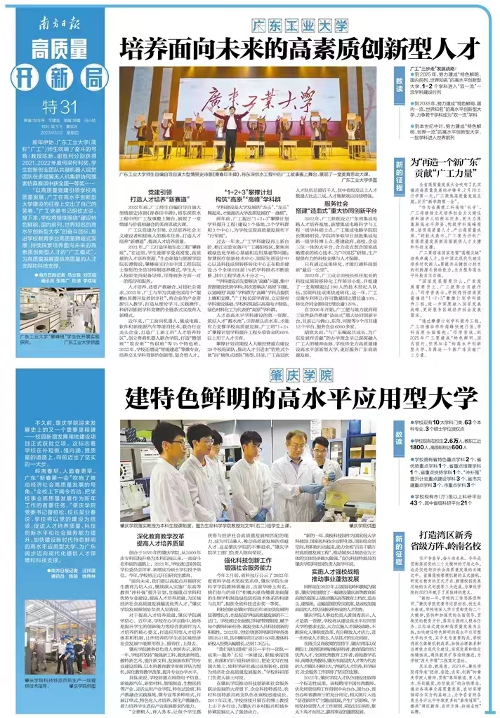 岭南春早,人勤春更早。广东“新春第一会”吹响了推动经济社会高质量发展的号角。“全校上下闻令而动,把学校事业高质量发展作为新年工作的首要任务。”肇庆学院党委书记曾桓松、校长吴业春说,学校将以党的建设为统领,促进人才培养质量、科技创新水平和社会服务能力提升,加快建设新时代特色鲜明的高水平应用型大学,为广东阔步迈向现代化提供人才保障和科技支撑。