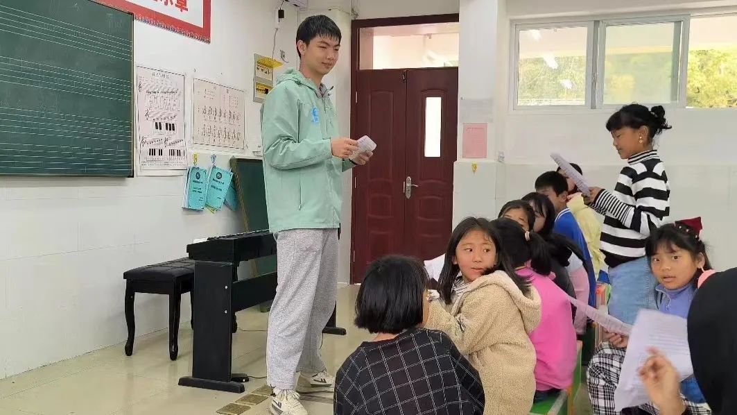 队员夏朝芃在给墨脱县德兴乡小学的学生上音乐课