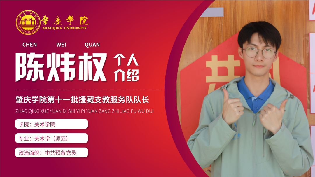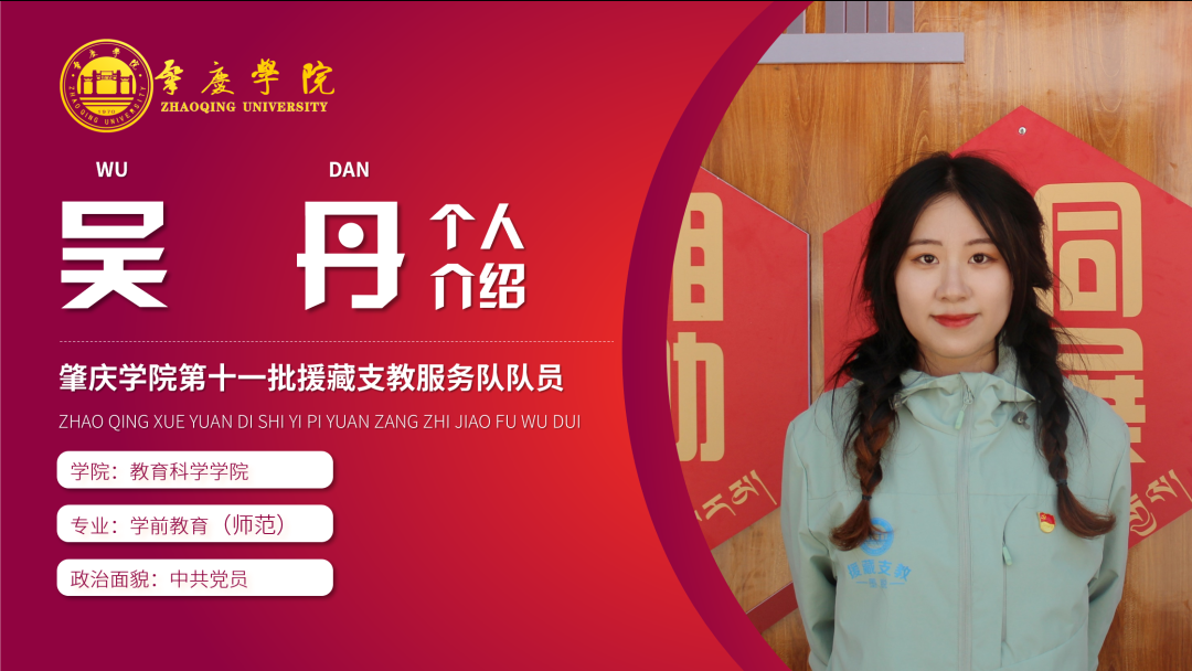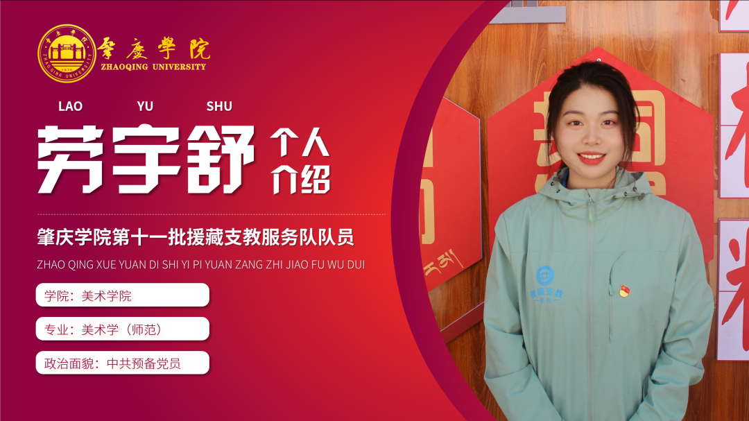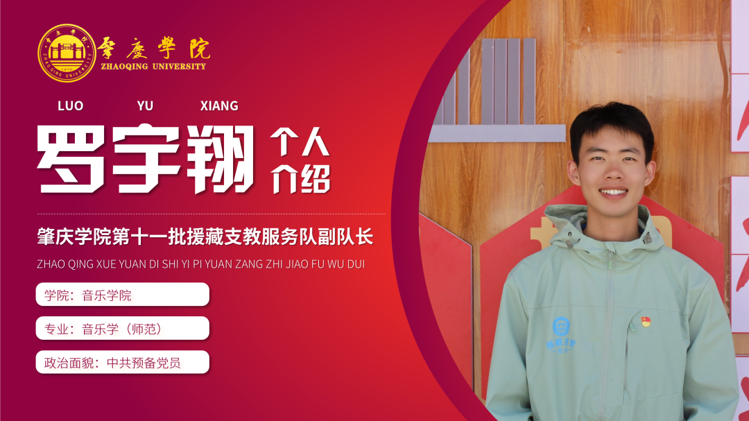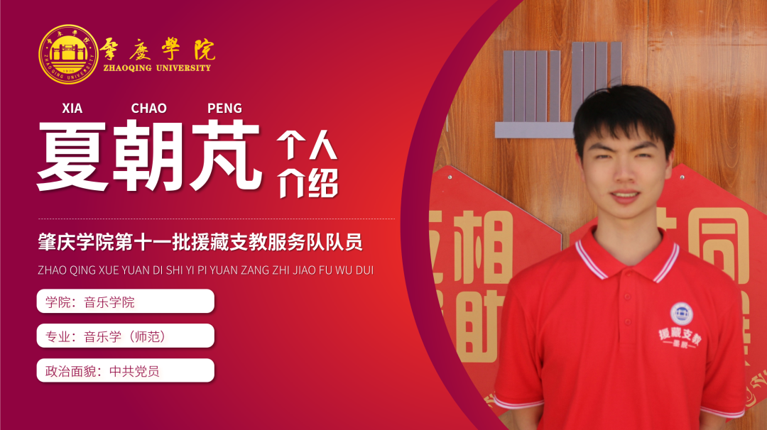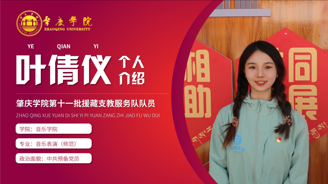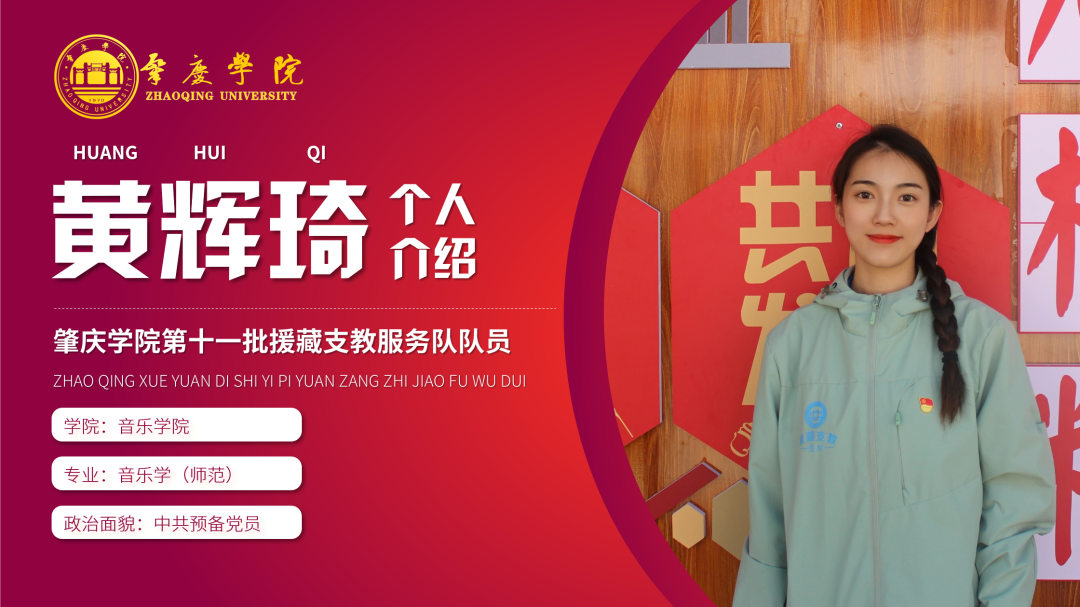 简介:现任肇庆学院第十一批援藏支教志愿服务队临时党支部宣传委员,音乐学学生第二党支部副书记,2021级新生带班党员、肇庆学院第八期砚园班成员,曾获国家奖学金与三好学生标兵,肇庆学院诵写讲大赛一等奖等荣誉。