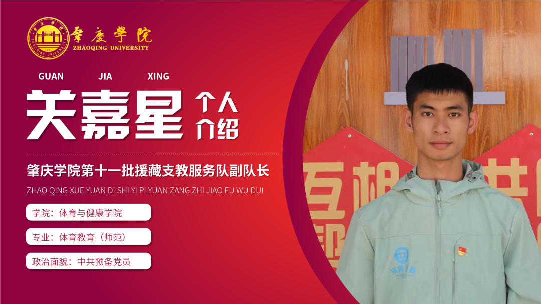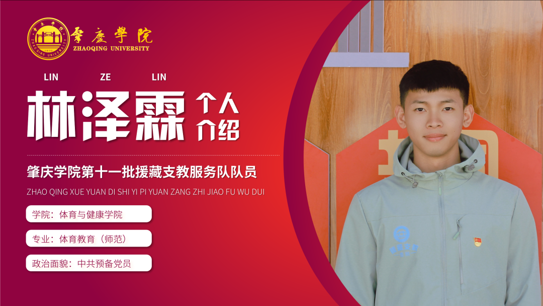 简介:现任肇庆学院第十一批援藏支教志愿服务队副队长,2022级新生带班党员,曾任校足球队队长、校足球队技术骨干,曾获2020-2021学年度三好学生标兵,曾代表学校参加广东省大学生运动会足球项目比赛获得第六名。