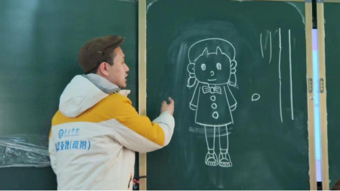 (美术学院喻泽铭同学正在讲述用简笔画画好一个小女孩)