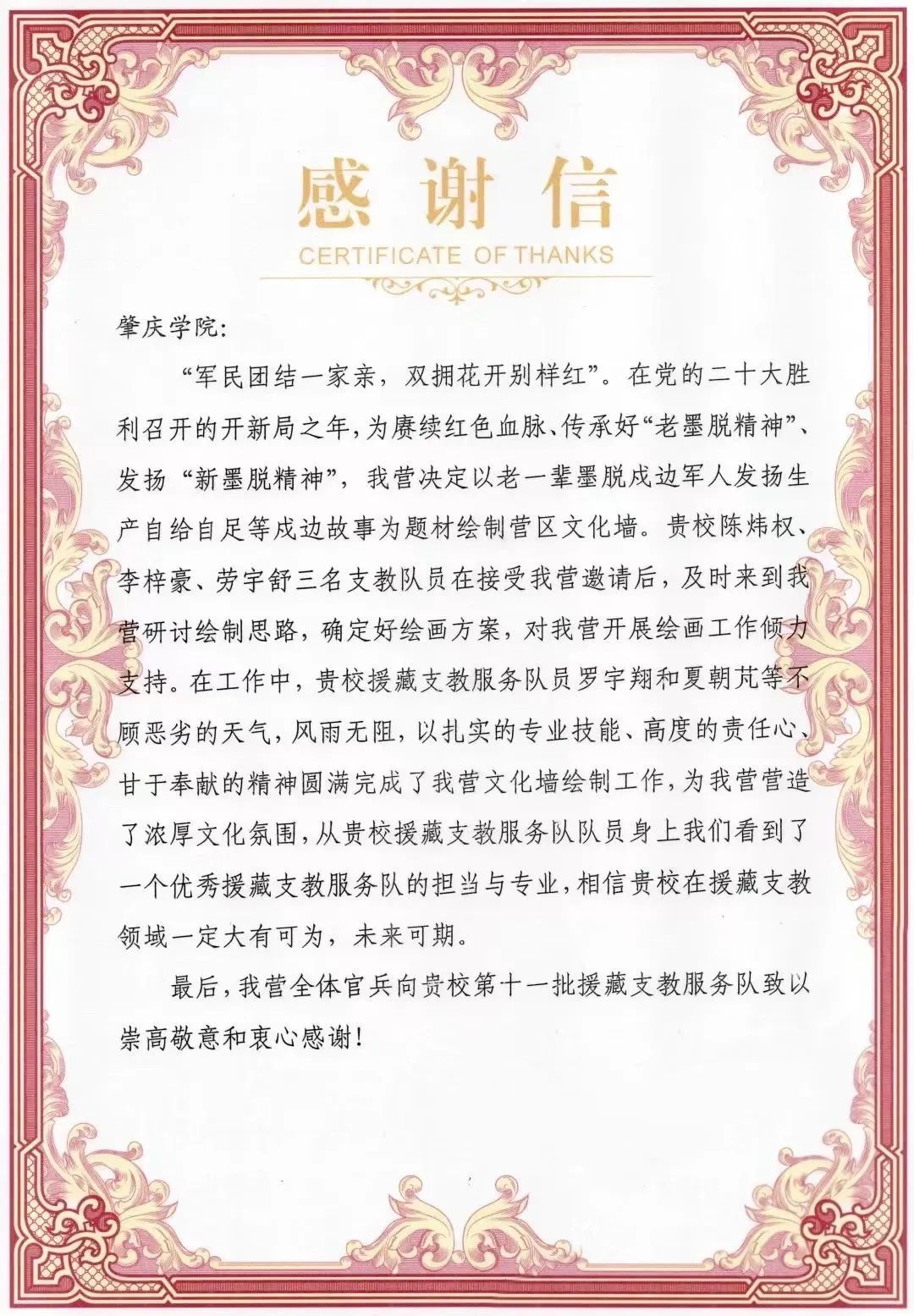 近日,我校收到一封来自墨脱戍边模范营的感谢信,信中感谢第十一批援藏支教服务队参与营区文化墙绘制,感谢服务队队员为戍边营文化建设作出了贡献。