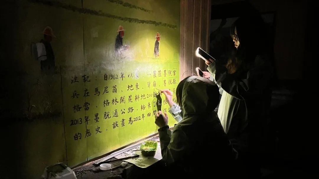 在周日晚上,擅长书法的劳宇舒等人要回县城准备下周一的教学,但是墙绘还剩下最后的文字说明没完成,参与墙绘工作的陈炜权、李梓豪、劳宇舒等队员们,深知肩负的责任,他们坚定地表示:“用手电照明,继续写吧” “戍边军人大雪封山都能继续巡边” “只是天黑了,这点困难不算什么”。即使是漆黑的夜晚,也无法阻挡他们完成任务的脚步。