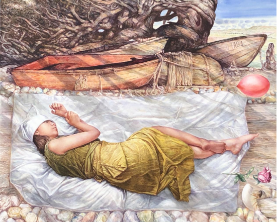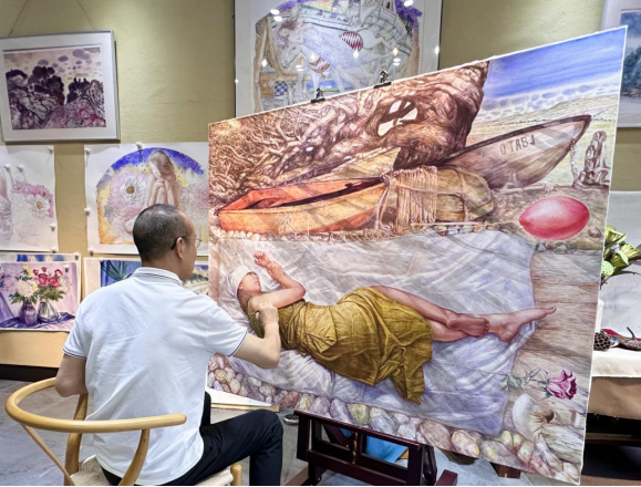吴健儿教授先后毕业于广州美术学院、日本国立东京学芸大学,现为肇庆学院美术学院特聘教授,肇庆学院国际艺术交流中心执行主任。此次入选的作品《休日的港湾》画中人物表现出人类面对美好的大自然产生愉悦、宁静心境的追求,与浮躁的现实生活和过剩的物质追求使人变得心浮气躁和焦虑形成对比,画面中光与影的跃动呈现出光明且明媚、充满生机的时代气息,整幅画作表现了将静谧、闲暇、安然、恬淡融为一体的意境。同时,“港湾”也意味着人类对平静祥和的生活状态的向往。吴教授表示,自己的作品能够入选是对自己莫大的肯定与鼓励,也是自己继续探索、发展艺术事业的动力。