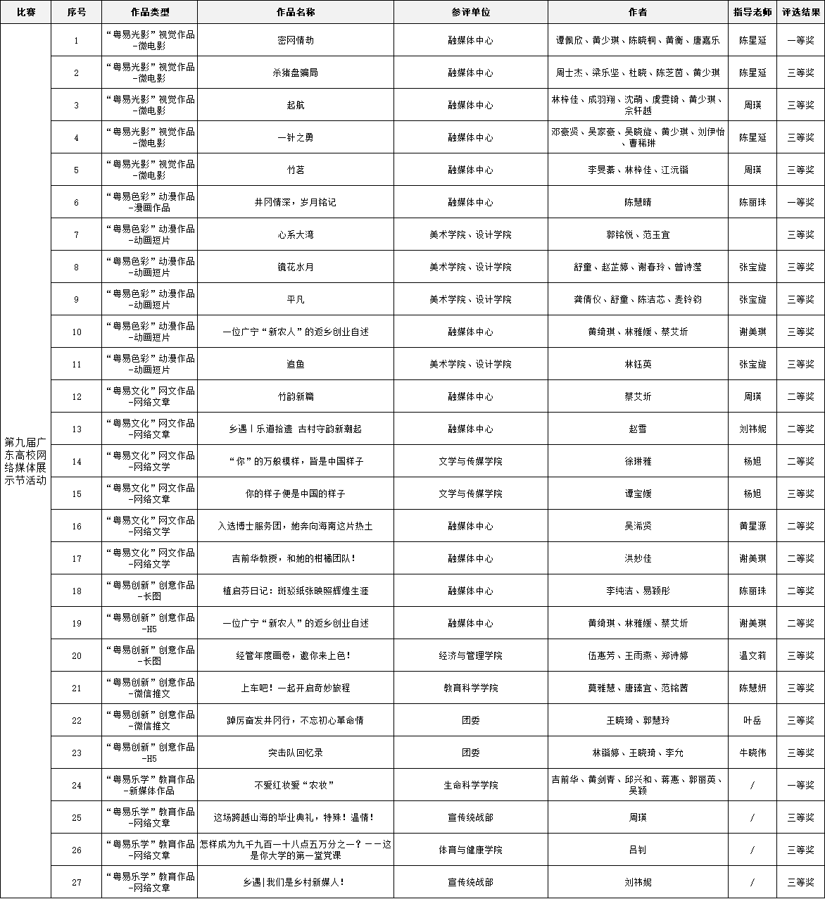 本网讯 近日,第九届广东高校网络媒体展示节活动获奖名单正式揭晓,我校共获得一等奖3项,二等奖5项,三等奖19项,同时获得优秀组织奖。