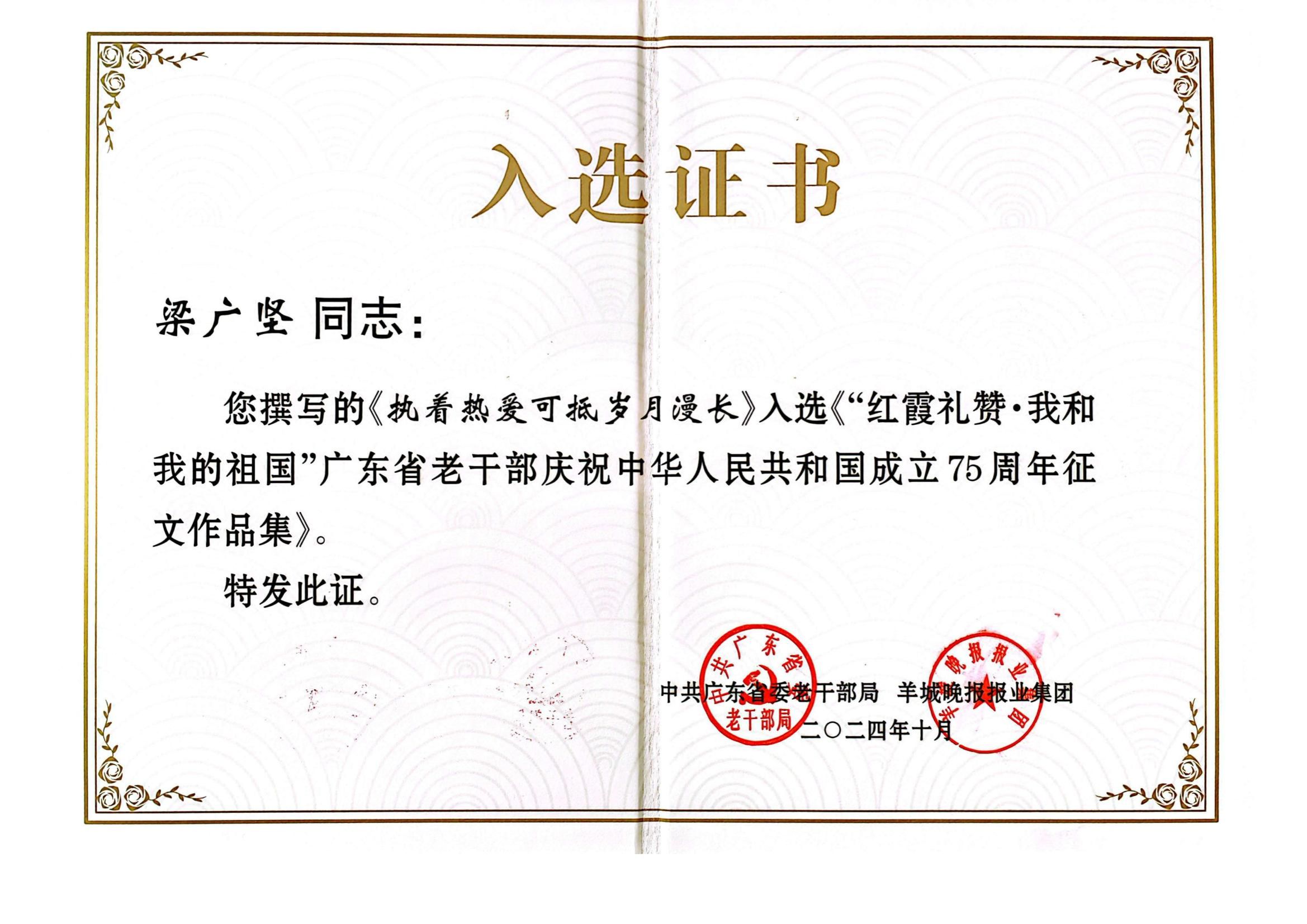 本网讯 近日,我校退休教师梁广坚教授的征文作品《执着热爱可抵岁月漫长》成功入选《“红霞礼赞·我和我的祖国”广东省老干部庆祝中华人民共和国成立75周年征文作品集》。