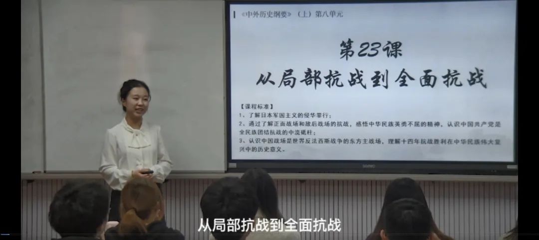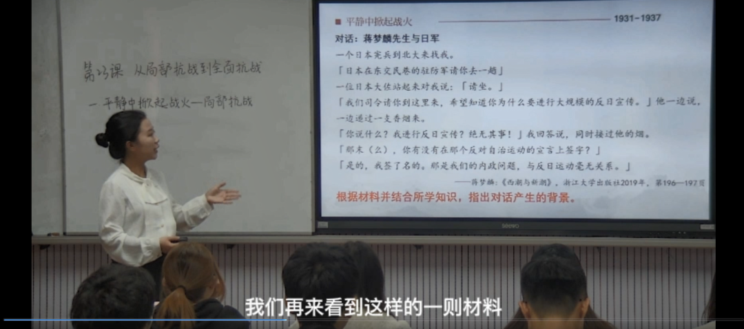 “这非常考验讲授者的再创作能力。”穆世毅表示,自己在准备第23课时,由于主题选定上的不成熟、不新颖、实操性不强,前后来回更换了四五次。就在她身处“山重水复疑无路”之困境时,导师秦宁东的一句指引——“你去看看纪录片《西南联大》吧”,让她“柳暗花明又一村”。最终,穆世毅从纪录片中寻得灵感,确定以“蒋梦麟眼中的抗战”这一独特的切入点为题展开教学。