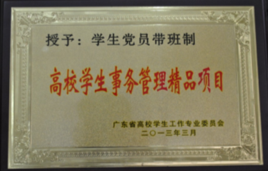 一分耕耘,一分收获。多年来,学生党员深入新生班级、引领新生成长的基层党建工作模式赢得社会各界的好评。以学生党员带班制为主要内容的我校书记项目“党建育才工程”于2012年12月被评为肇庆市首届组织工作“十大品牌”,2013年4月评为全省高校实施抓基层党建创新优秀“书记项目”。同年,学生党员带班工作获评广东省高校学生事务管理精品项目,被编入《高校学生事务管理精品项目》;2014年度获省委教育工委通报表扬。