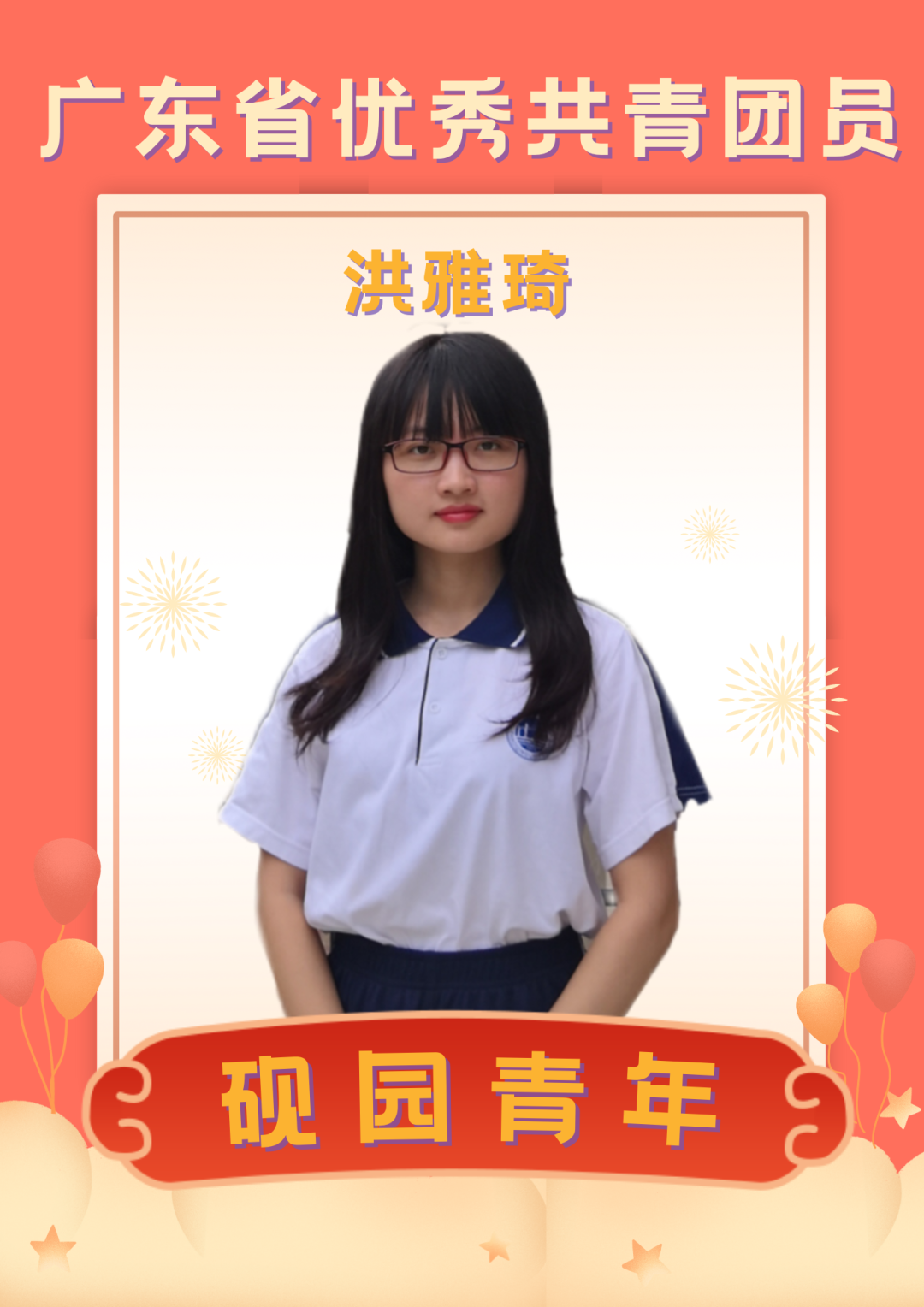 洪雅琦,女,中共党员,先后担任生命科学学院学生会主席团成员、学生带班党员。曾荣获国家奖学金、广东高校师生党员“知史爱党”党史学习挑战赛“学习积极分子”、第十二届“挑战杯”广东大学生创业大赛铜奖和肇庆市“优秀共青团员”。她负责的国家级大学生创新训练项目已顺利结项,并在北大中文核心期刊发表论文一篇(第二作者)。