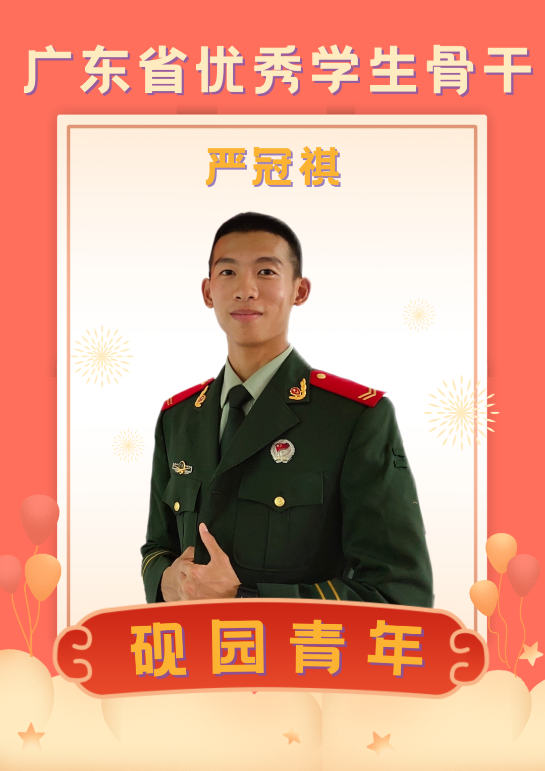 严冠祺,男,中共预备党员,现任肇庆学院学生会执行主席。他2017年服役于中国人民解放军,2019年退伍复学。他作为一名学生骨干,在学习和生活中继续发扬军人的优良传统和过硬作风,理想信念坚定,敢于担当,勇于奉献。他曾获2020-2021年度国家奖学金,校级“三好学生”“自强之星”“年度大学生人物标兵”等荣誉;他参加第十三届“挑战杯”广东大学生创业计划竞赛获铜奖,创作抗疫作品荣获广东省高校媒体展示节一等奖,参加广东省校园足球“省长杯”获二等奖。