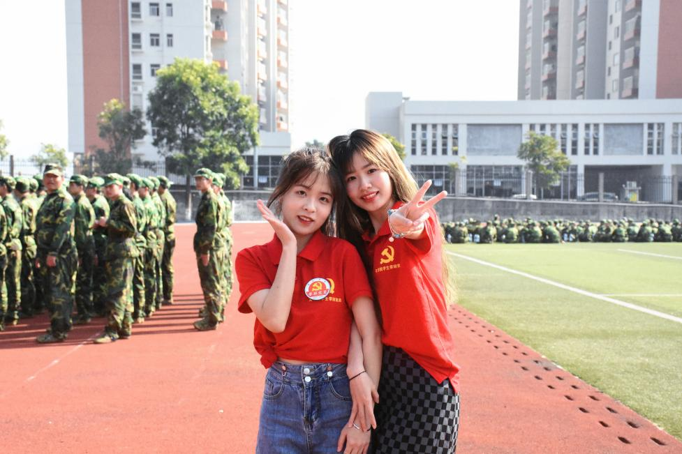 (图左为在军训场上陪新生训练的杨燕珊)